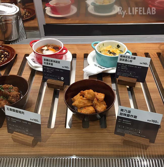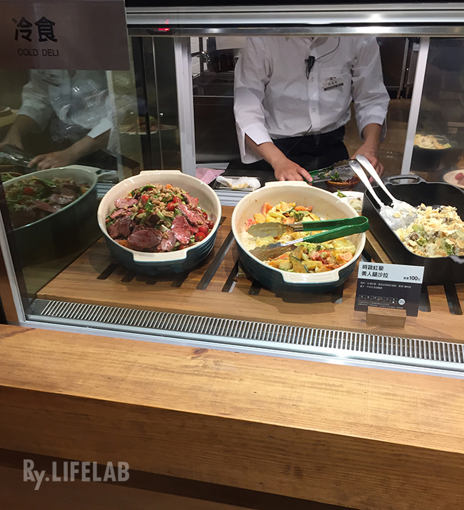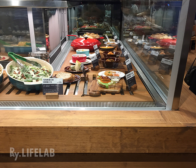 入口左側的L型透明的櫥窗展示著各式冷食及熱食的菜色,方便客人邊流口水邊考慮待會要吃啥,
