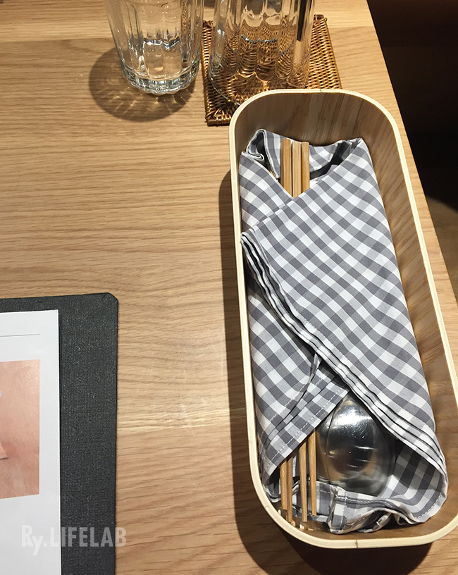 筷子和湯匙拿出來之後,底下放置印著餐廳LOGO的乾濕紙巾。