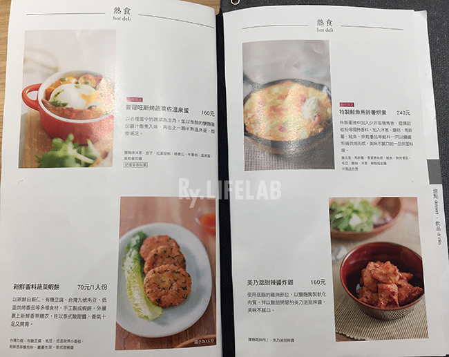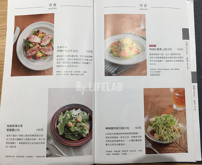 菜單上都有說明食材來源,餐點照片及說明相當清楚,分冷熱食,部分為台中店限定。除了單點也可選擇套餐,