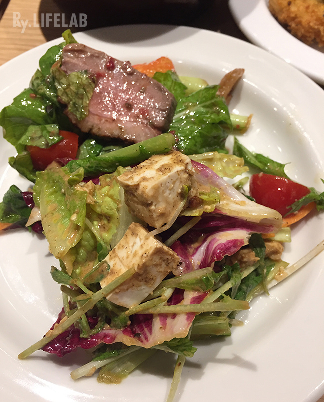 比較靠近鏡頭的是”棒棒雞時蔬豆腐沙拉”,菜單提到有混合芝麻醬和棒棒雞醬兩種醬汁,