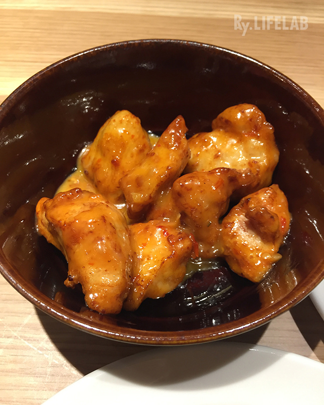 這是"美乃滋甜辣醬炸雞",較深的橘黃色一上菜便吸引了Ray的目光,雖然是使用雞胸肉的部位,