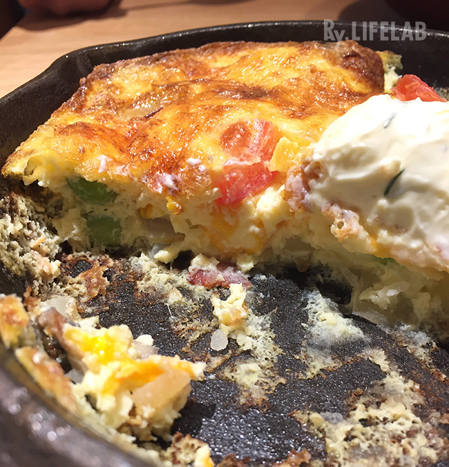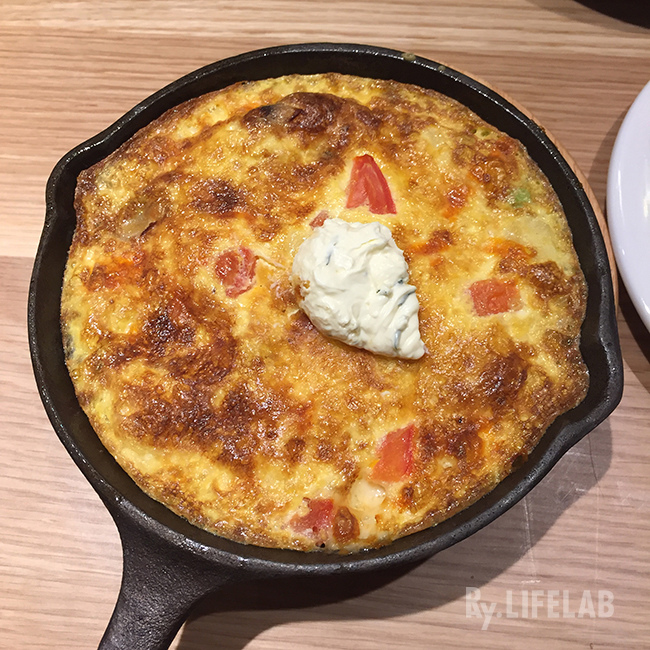最後登場的是"特製鮭魚馬鈴薯烘蛋",上菜時用著熱騰騰的平底鑄鐵鍋裝著。這道菜是台中限定,